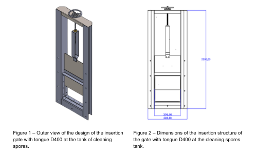 The valve consists of a body, a gate valve (valve tongue), sealing plates with rubber pads, a worm-screw drive and a flywheel. The body is made of stainless steel. AISI 304 5 mm thick, by laser cutting and bending, which ensures high manufacturing accuracy and corrosion resistance. Ball screw (screw mechanism) is made of black metal with a brass insert that has an internal thread. This combination of materials ensures smooth movement, durability and minimal friction during operation. The design allows for easy disassembly for preventive maintenance or repair.