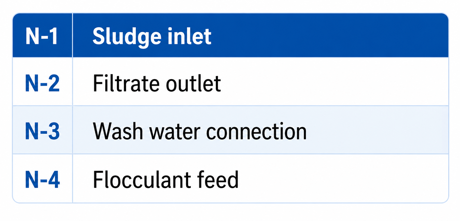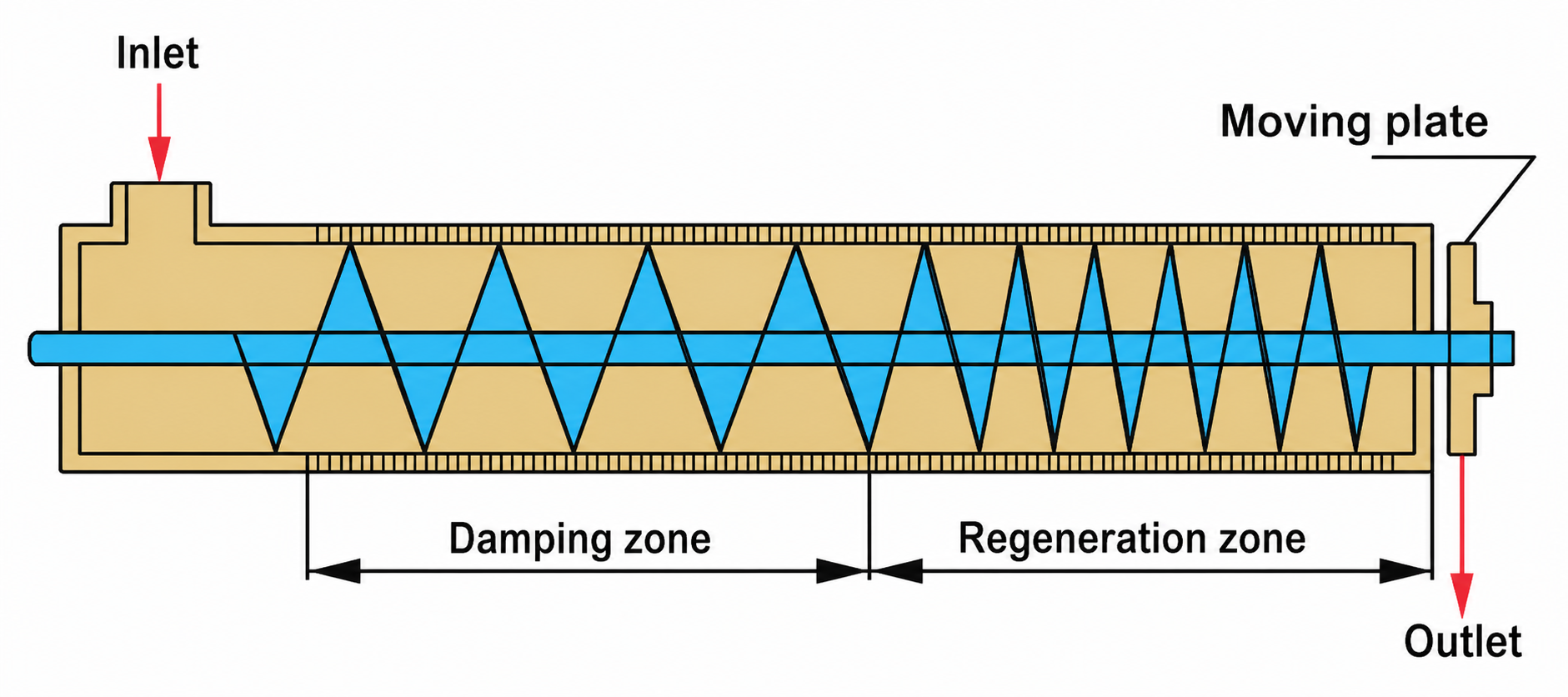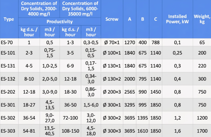After treatment with flocculant, the sediment is fed to the dewatering unit. During the dewatering process, the filtrate flows out of the gaps between the rings. The width of the gaps decreases in the direction of the cake outlet. In the thickening zone, it is 0.5 mm; in the dewatering zone, it narrows from 0.3 mm to 0.15 mm. The pitch of the screw turns also decreases, creating pressure in the dewatering zone, while the volume of the sediment decreases. A pressure plate is installed at the end of the screw, which regulates the internal pressure in the drum