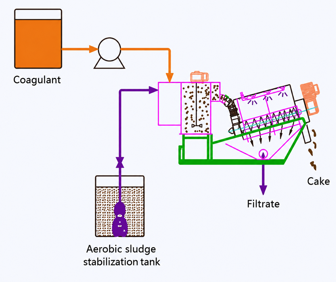 The cake is dumped into a container, and the filtrate goes to the head of the treatment plant.