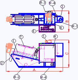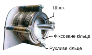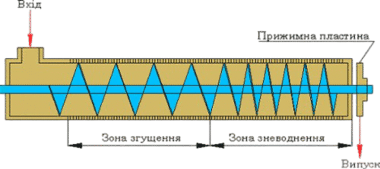 Вузол зневоднення складається із шнеку, що обертається із постійною швидкістю між фіксованими кільцями, рухомих кілець та зазорів. Шнек здійснює рух кілець між зазорами і таким чином запобігає засміченню барабану